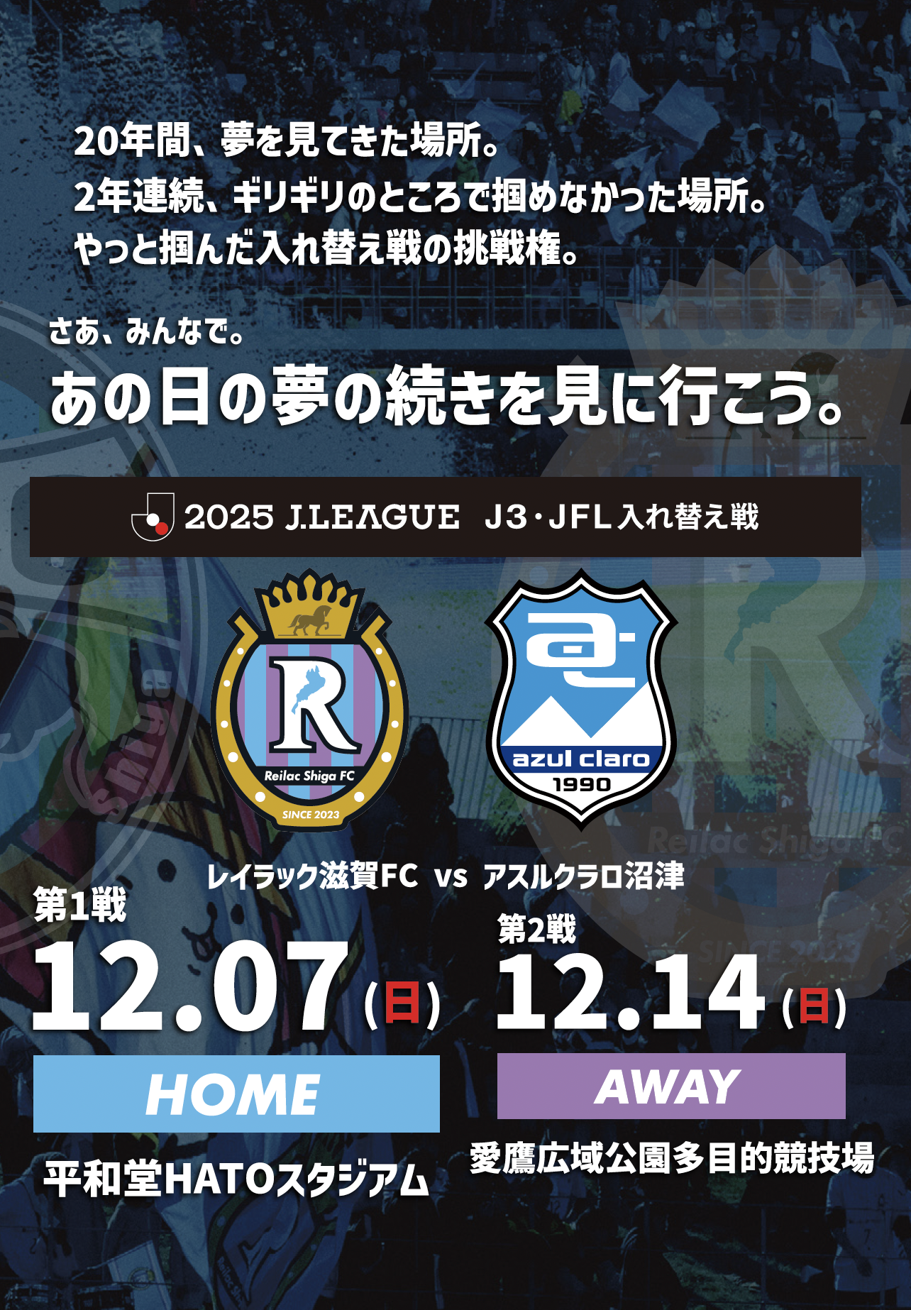 株式会社Mi-Oスポーツ (レイラック滋賀)レイラック滋賀FC vs アスルクラロ沼津 12.7 Sun 平和堂HATOスタジアム 12.1...詳しく見る